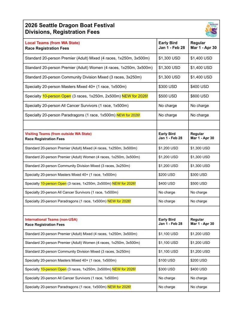 If an insufficient number of teams register for the festival, the Seattle Flying Dragons may cancel the event with a minimum of 30 days notice. In this case, each registered team will receive a full refund of their race registration fees only.